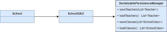 SerializablePersistenceManager, która daje możliwość zapisu klas (SchoolClass) i nauczycieli (Teacher) do pliku (za pomocą mechanizmu serializacji) - szczegóły na diagramie klas. Podczas każdego wywołania metodySchoolDAO.addTeacher(Teacher)orazSchoolDAO.addClass(SchoolClass), dane klas i nauczycieli są zapisywane do pliku.